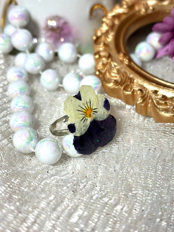 Anillo de metal regulable con flor de Viola/Pensamiento encapsulada en resina.