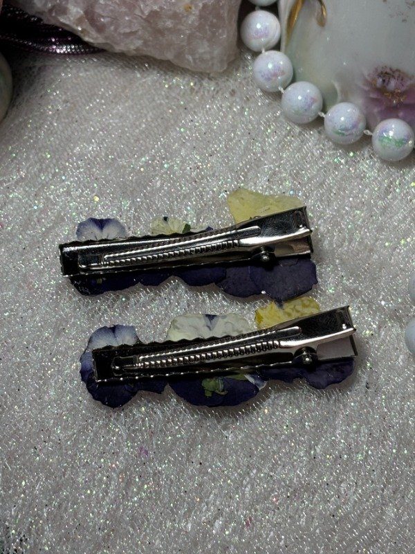 Par de hebillas cocodrilo metálicas hechas con flores reales encapsuladas en resina.