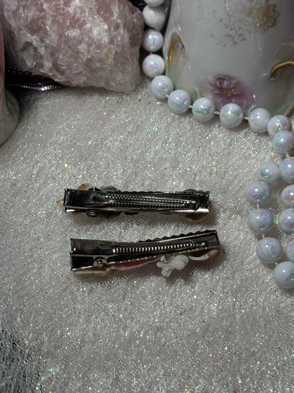 Par de hebillas cocodrilo metálicas con pedazos de piedras y caracoles encontradas en la orilla del Mar Argentino.